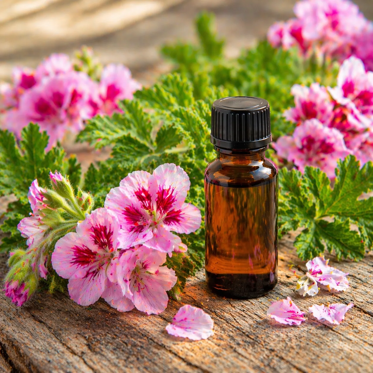 Geranium Rose Essential Oil is steam distilled from the leaves and flowering tops of Pelargonium graveolens. This variety is particularly valued for its soft, rosy floral aroma, offering a profile reminiscent of rose with fresh green undertones.